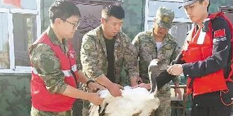 检查丹顶鹤的伤情。